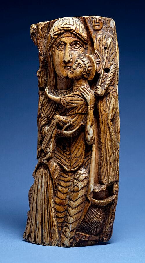 This unusually large ivory carving, its shape corresponding to the shape of a tusk, shows the Christ Child embracing his mother in a pose of tender intimacy. It is one of the earliest examples of what in later Byzantine times was called Eleousa, or "Virgin of Tenderness." The relief was likely to have been used for private devotion, in either a monastic or domestic setting, as an icon (Greek for "image"). Especially striking and typical of the early medieval period in Christian Egypt are the Virgin's large head, fixed gaze, and angular drapery. By Anonymous (Coptic artist)Anonymous (Byzantine artist) - Walters Art Museum: Home page Info about artwork, Public Domain, https://commons.wikimedia.org/w/index.php?curid=18794368