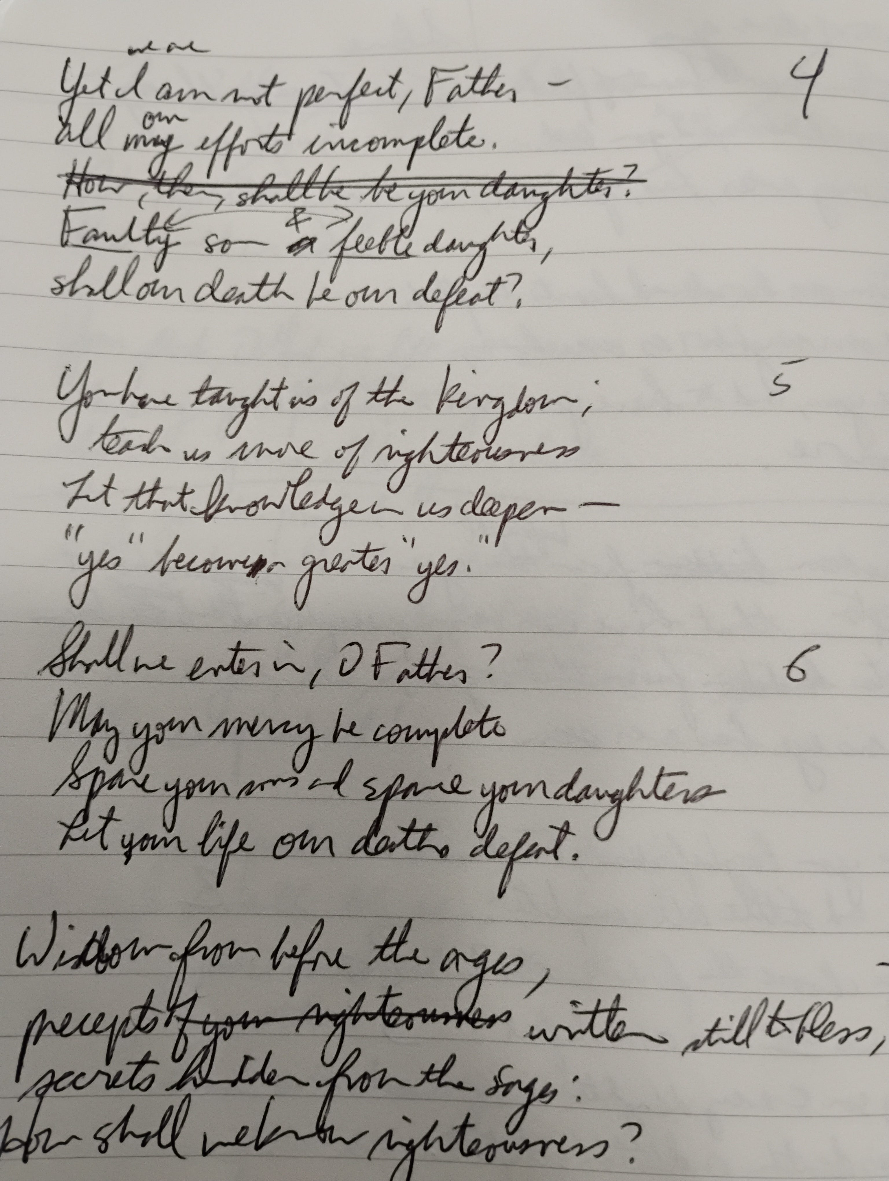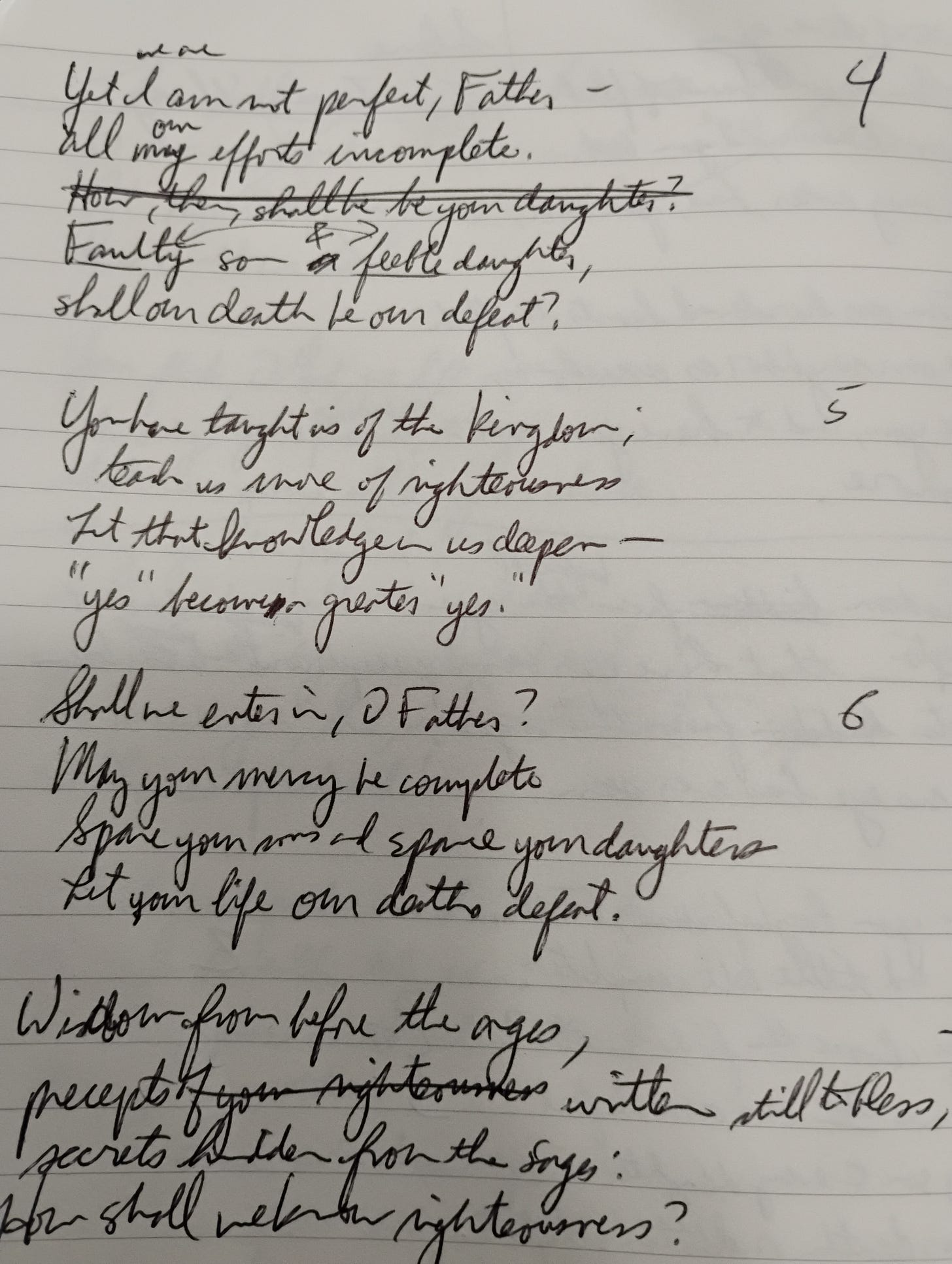 Wisdom from before the ages, precepts written still to bless, secrets hidden from the sages: How shall we know righteousness? These you lay before us, Father, jot and tittle all complete. Every son and every daughter chooses death or death’s defeat. Nothing, then, could be more urgent than a thirst for righteousness. If we are, as you are, perfect, you, O Lord, will see and bless. Yet we are not perfect, Father— all our efforts incomplete. Feeble son and faulty daughter: Shall our death be our defeat? You have taught us of the kingdom; teach us more of righteousness. Let that knowledge in us deepen, “yes” become a greater “yes.” Shall we enter in, O Father? May your mercy be complete. Spare your sons and spare your daughters: Let your life our deaths defeat.